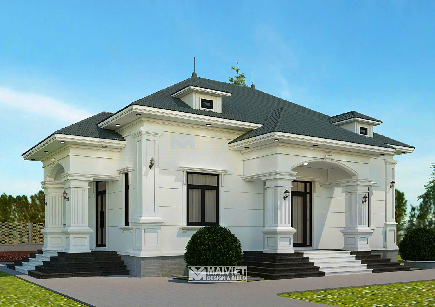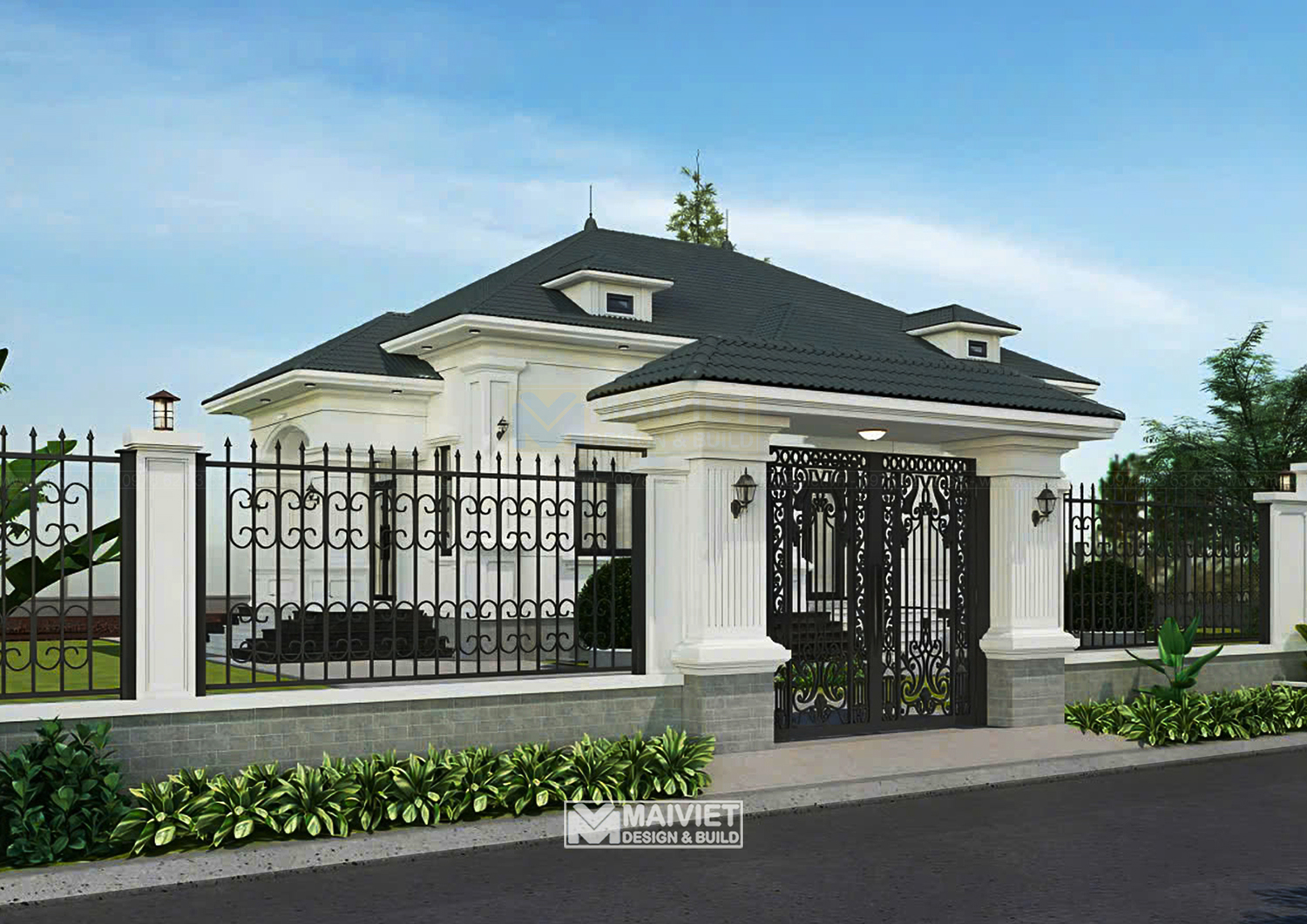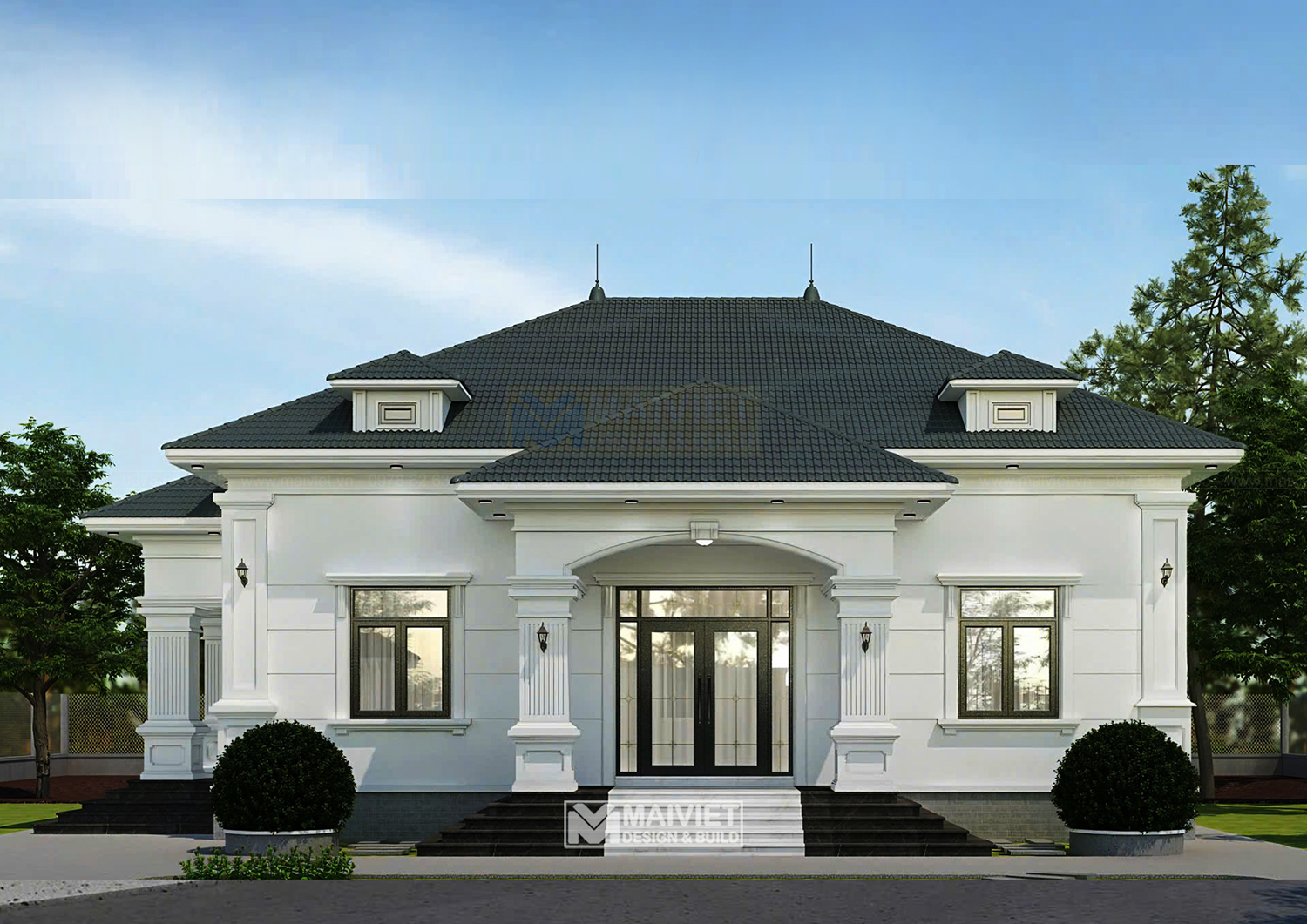 Màu sắc tinh tế: Tông màu trắng chủ đạo kết hợp cùng hệ mái màu xanh ghi tạo nên sự tương phản sang trọng, giúp ngôi nhà luôn nổi bật giữa không gian sân vườn xanh mát.