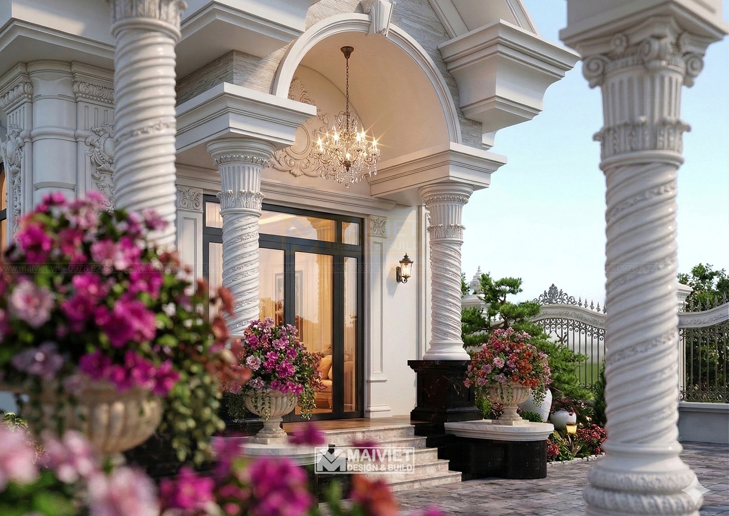Hệ cột trụ bề thế: Mặt tiền sử dụng hệ cột tròn được trang trí bằng các đường gờ chéo độc đáo, kết hợp cùng các bức phù điêu chạm khắc tinh xảo ở đầu cột, mang lại cảm giác vững chãi nhưng vẫn mềm mại.