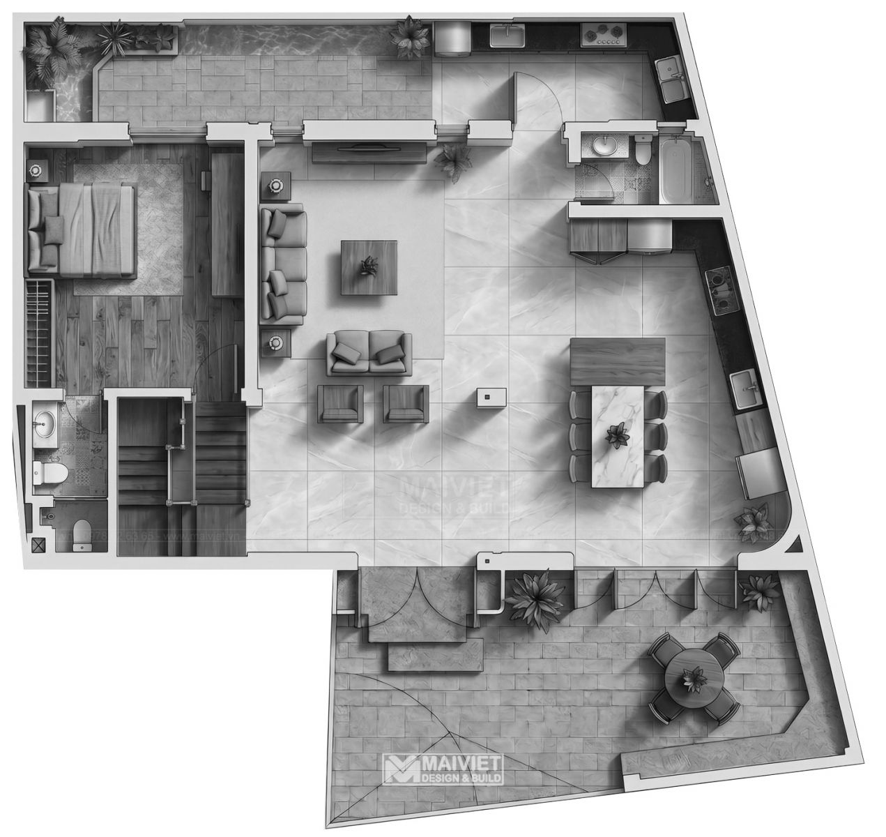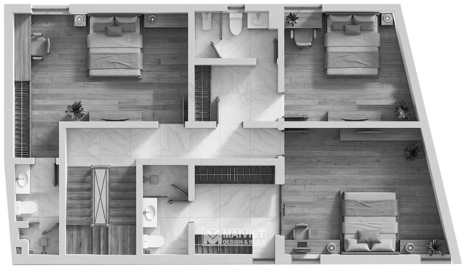 Căn nhà phố 3 tầng được thiết kế dành cho gia đình 03 thế hệ, 04 phòng ngủ là 4 phong cách khác nhau với đầy đủ các công năng bên trong, không gian phòng thờ và sân thượng lớn được đưa lên tầng trên cùng.