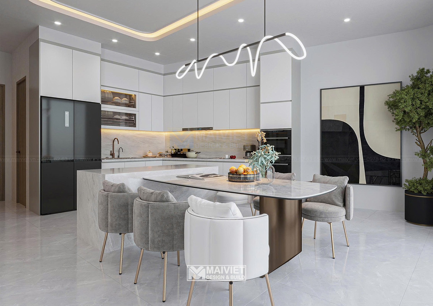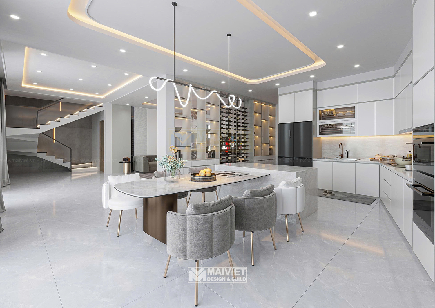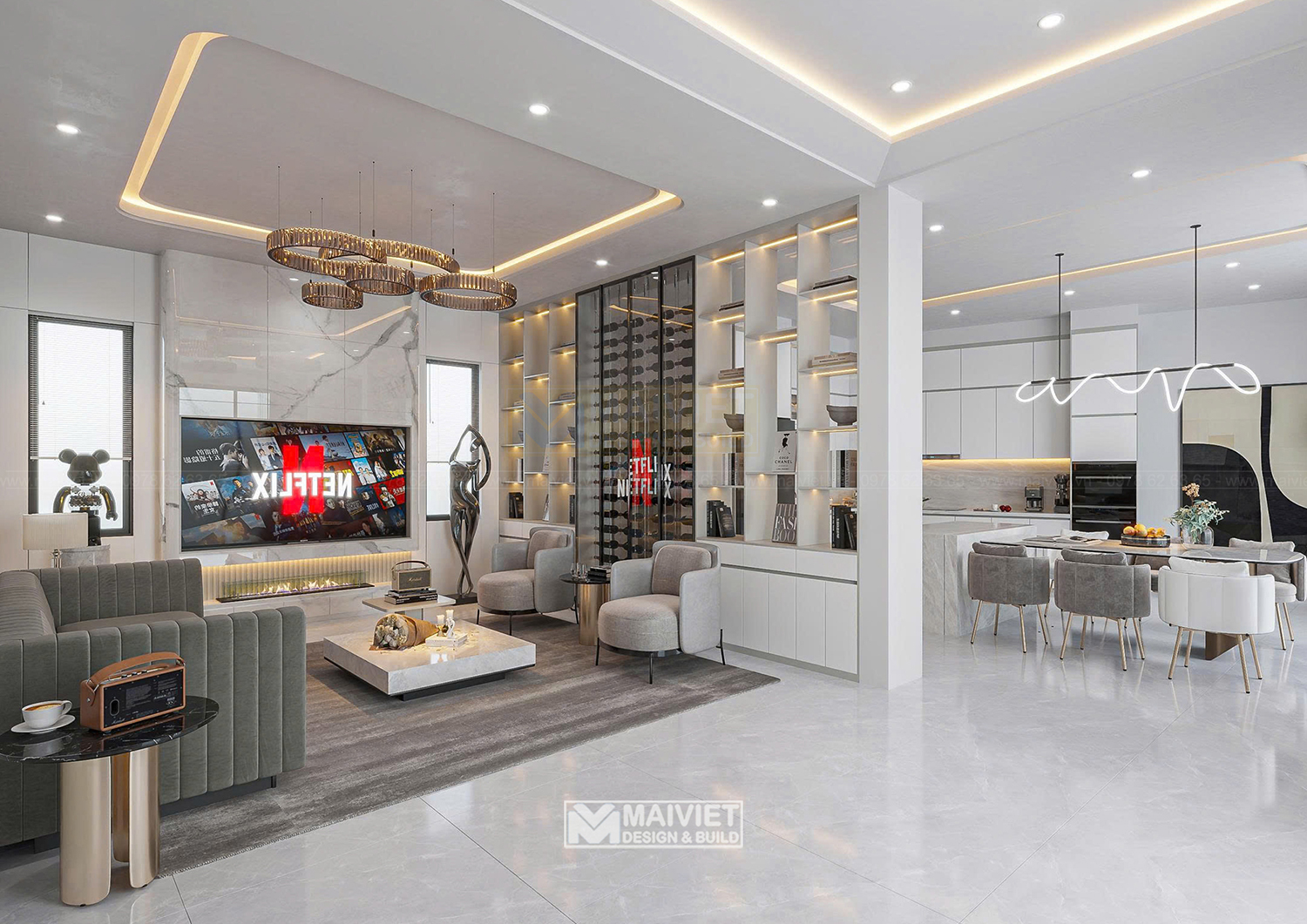 Không gian phòng khách liên thông bếp tạo ra cảm giác thoáng mát và rộng rãi