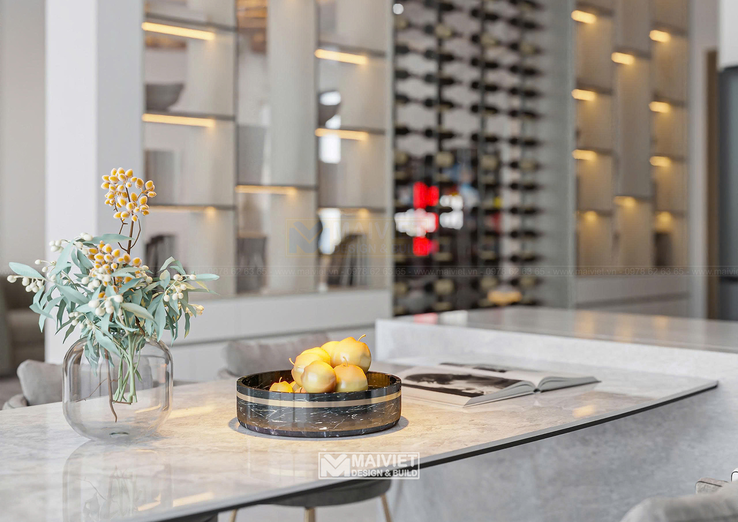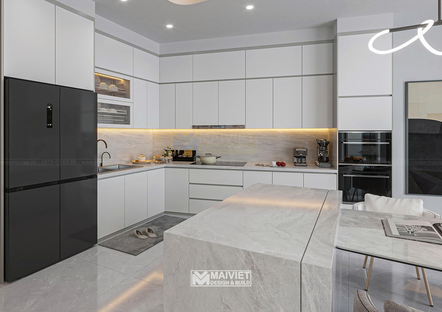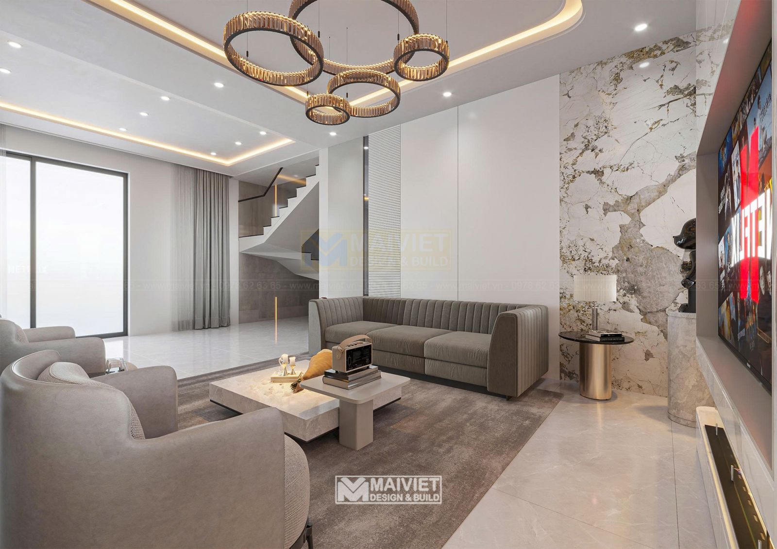 Không gian phòng khách liên thông bếp tạo ra cảm giác thoáng mát và rộng rãi