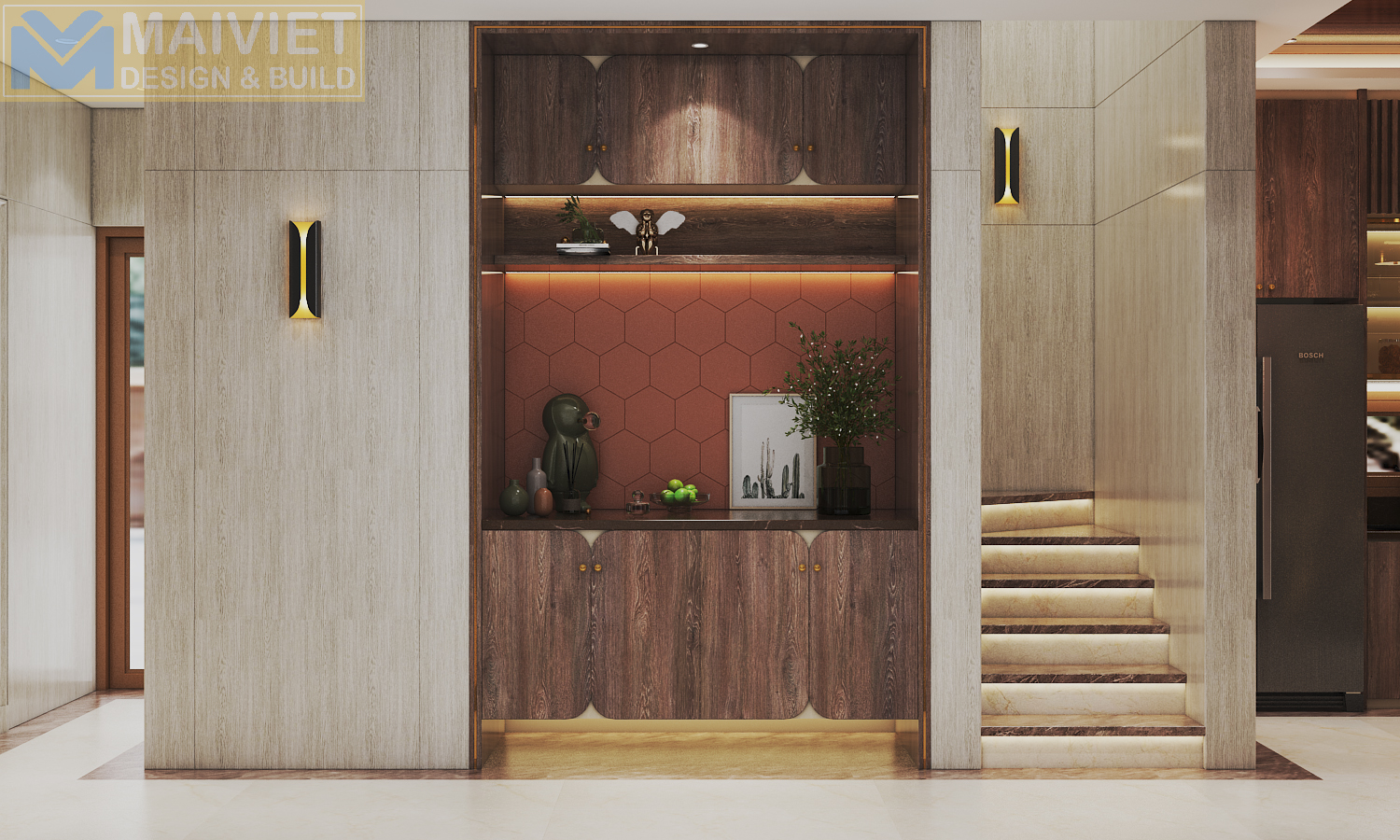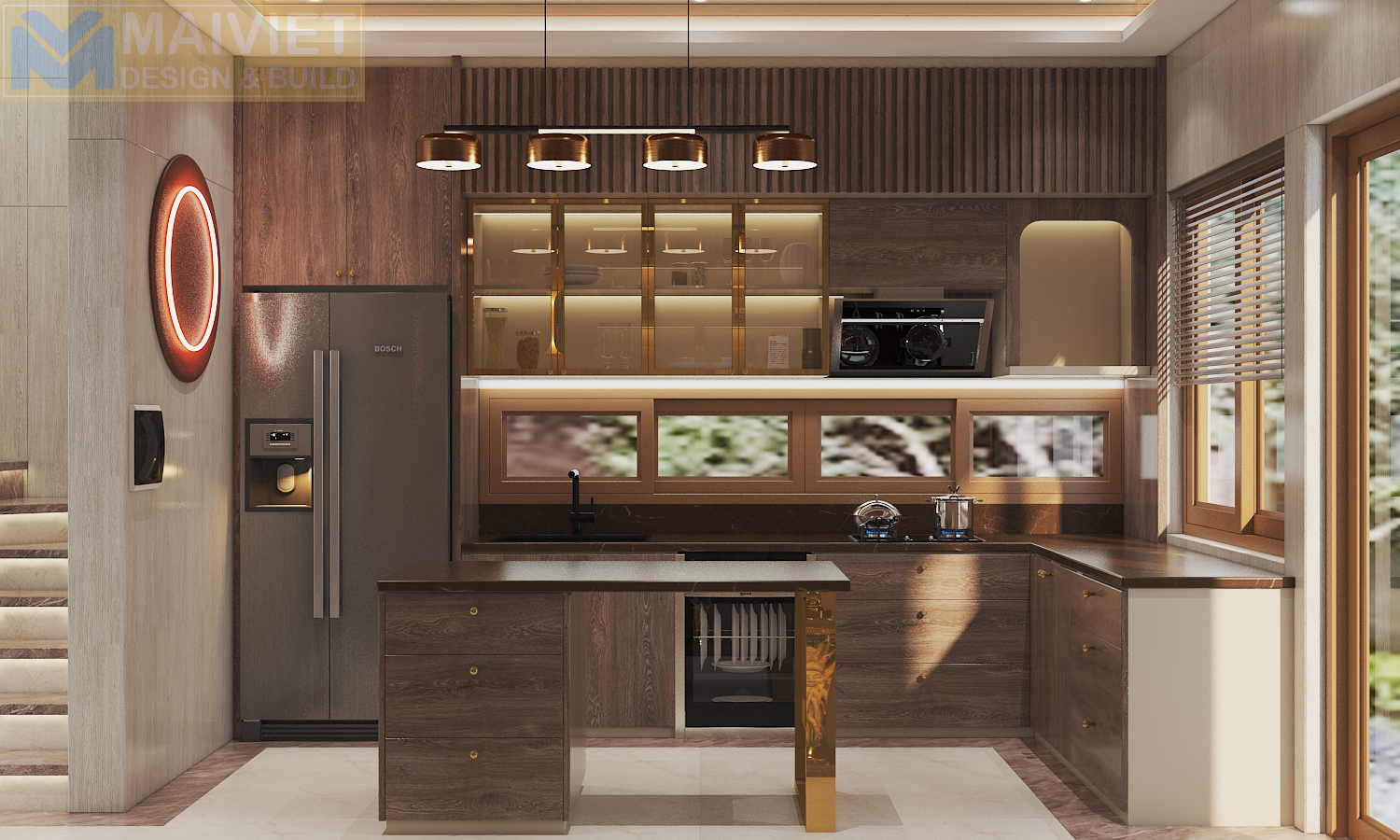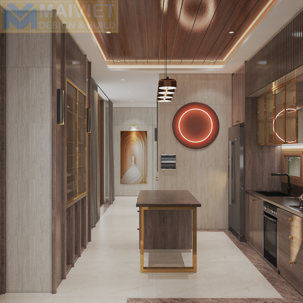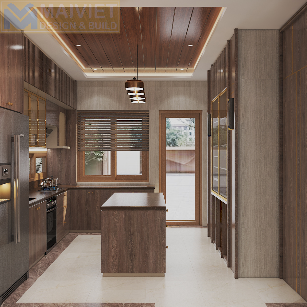 Khu bếp (Hình 2) tiếp tục ngôn ngữ thiết kế chung. Nó phá vỡ định kiến về một căn bếp hiện đại thường lạnh lẽo.- Ấm cúng và Tiện nghi: Hệ tủ bếp kịch trần, đảo bếp, và cả trần giật cấp đều được ốp gỗ đồng bộ, tạo cảm giác liền mạch và ấm áp lạ thường. Đây không chỉ là nơi nấu nướng, mà là nơi cả gia đình quây quần.