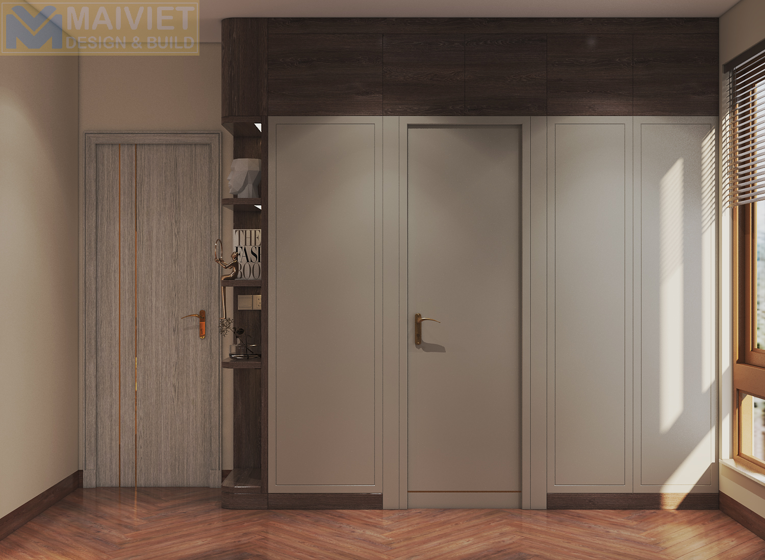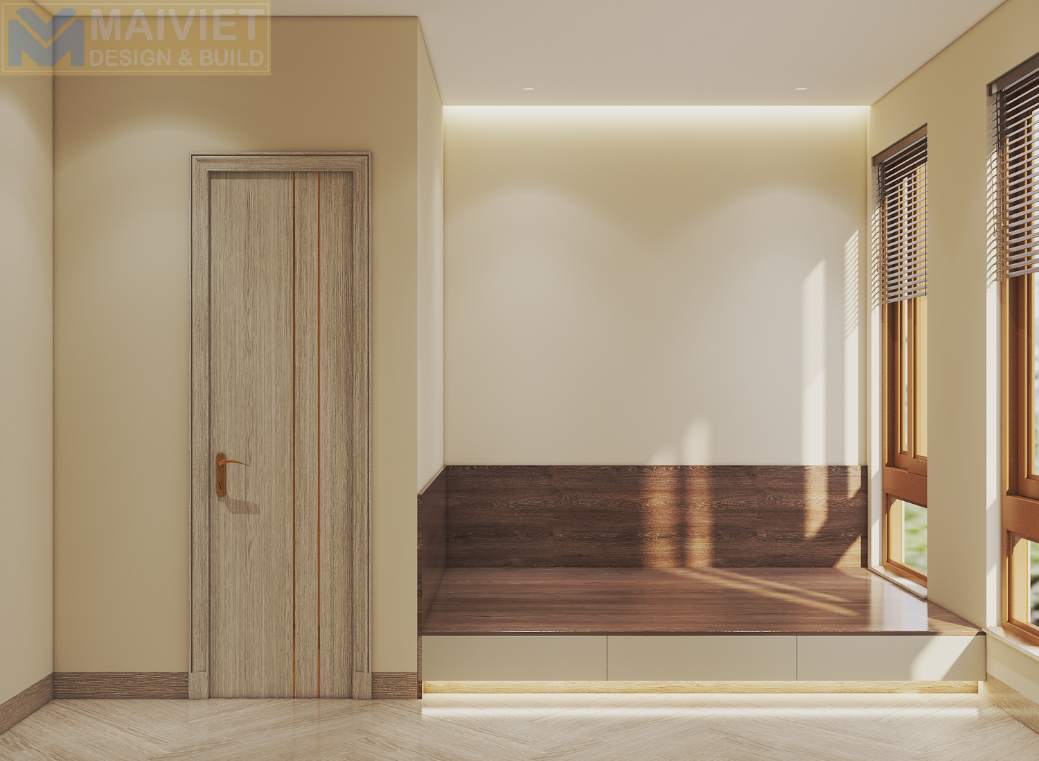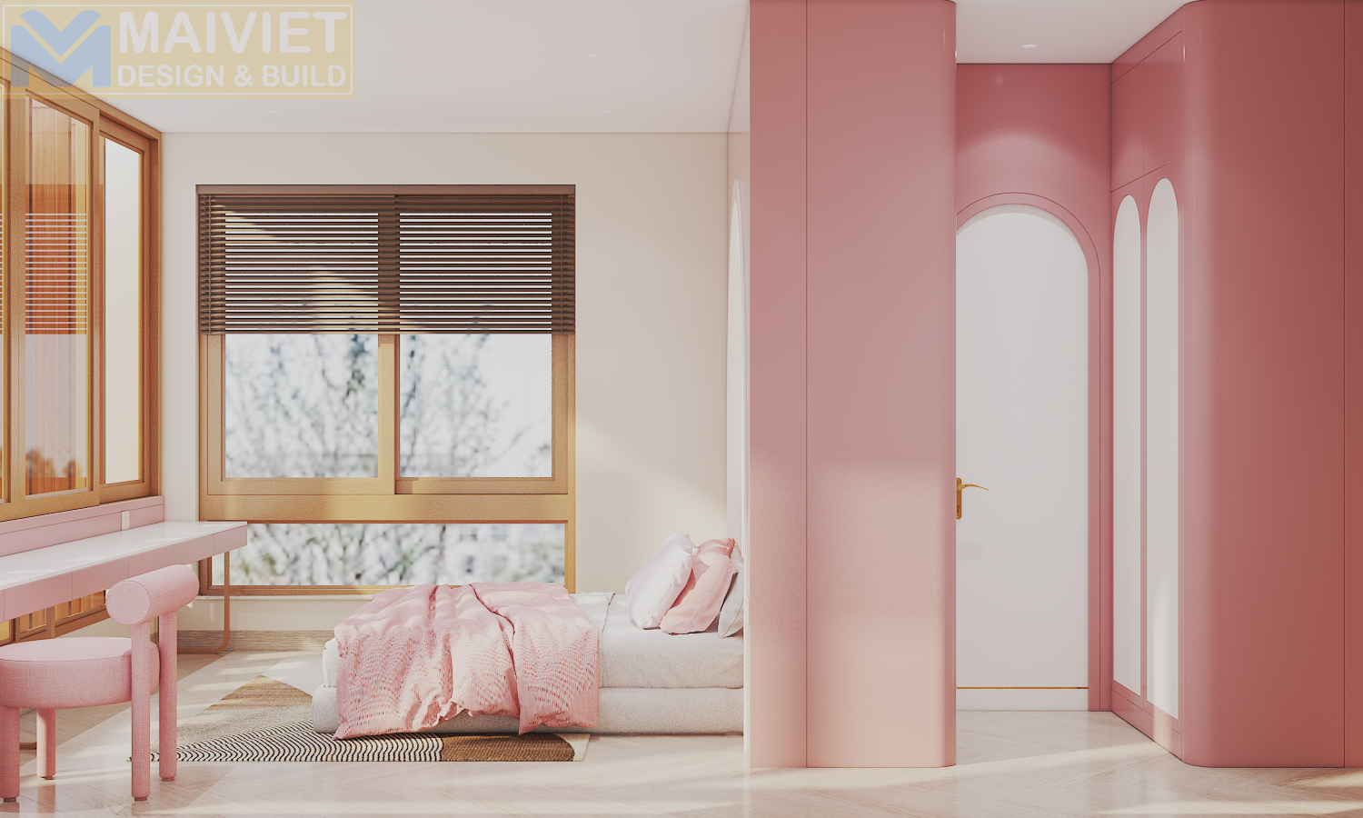 Cân bằng: Toàn bộ sự ngọt ngào này được cân bằng lại bởi sàn nhà sáng màu và hệ cửa sổ khung gỗ tự nhiên—một "chữ ký" kiến trúc xuyên suốt, kết nối căn phòng này với ngôn ngữ chung của cả ngôi nhà.