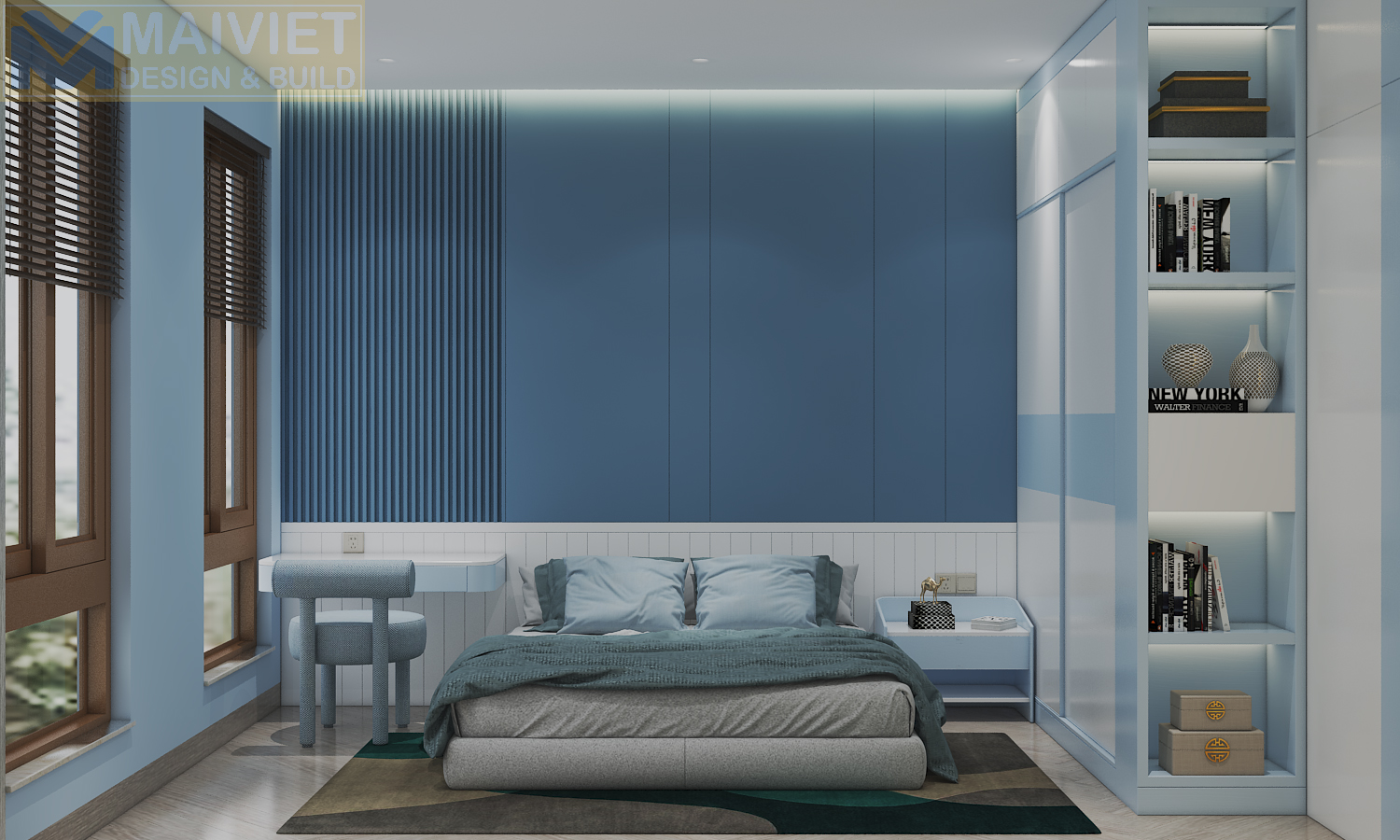 Ánh sáng tự nhiên: Không gian phòng ngủ được ưu tiên tối đa ánh sáng tự nhiên. Các ô cửa sổ lớn ở cả hai phía bức tường không chỉ lấy sáng, mà còn mở ra tầm nhìn, giúp chủ nhân căn phòng kết nối với bên ngoài ngay khi thức giấc.