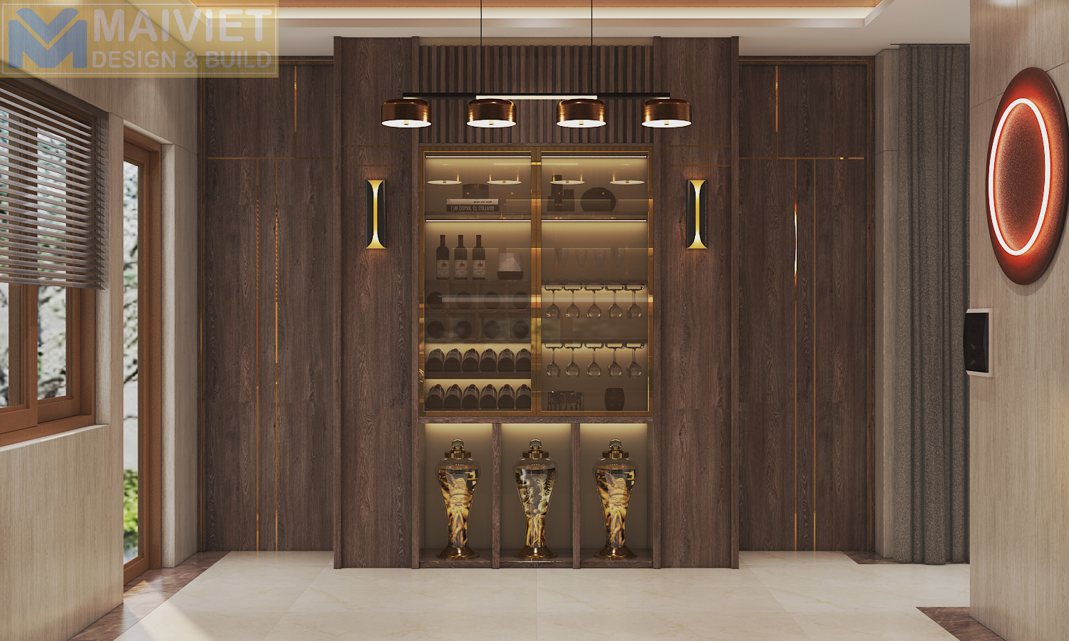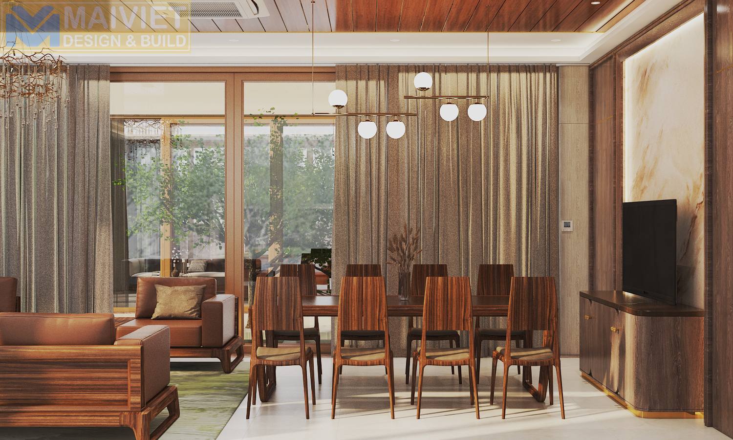- Ánh sáng và Vật liệu: Ánh sáng được thiết kế đa lớp, từ hệ đèn LED âm trần, đèn hắt gián tiếp trên trần gỗ, đến đèn thả trên đảo bếp, tạo ra nhiều kịch bản ánh sáng cho các hoạt động khác nhau. Sàn gạch sáng màu tương phản, giúp cân bằng lại sắc trầm của gỗ và làm không gian thêm phần rộng rãi, sạch sẽ.