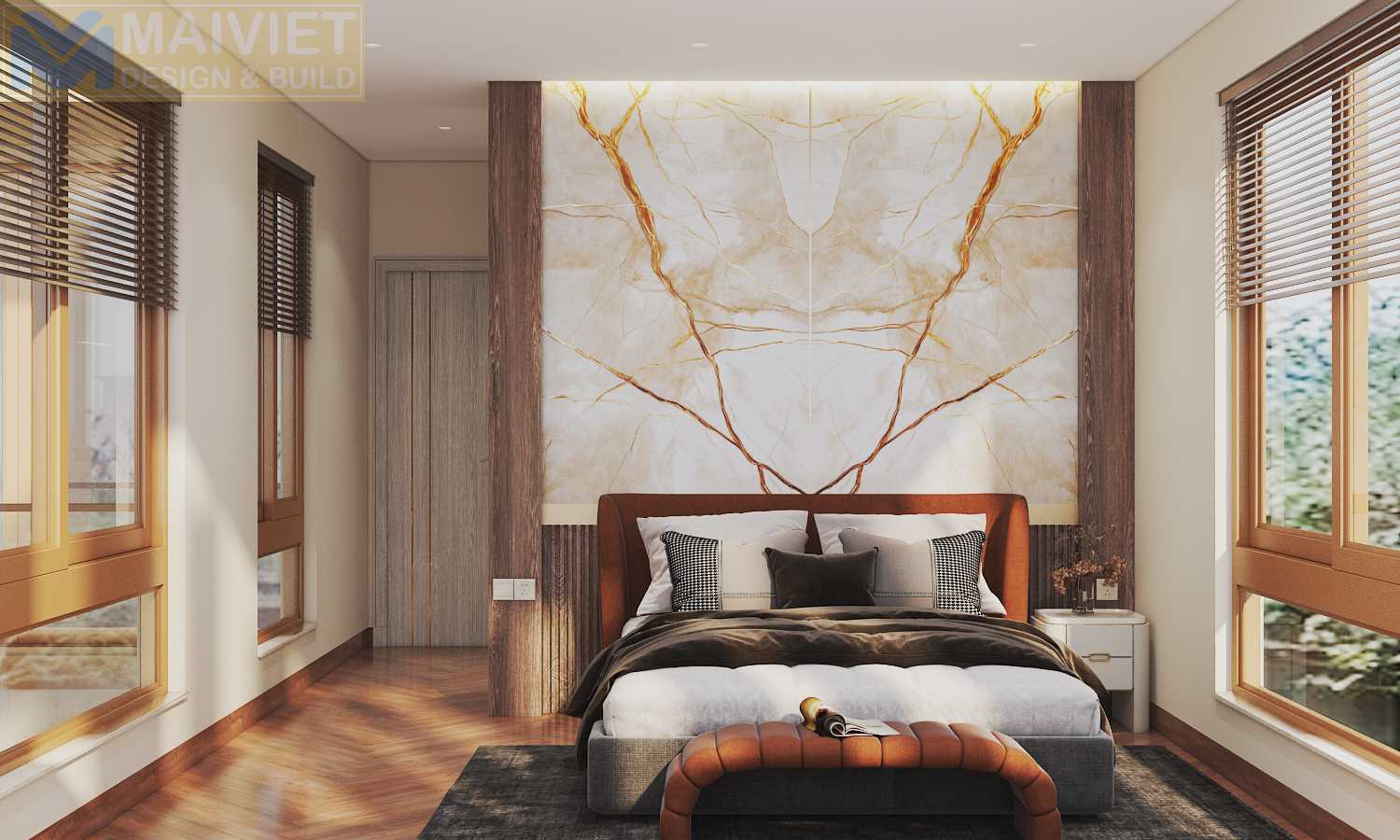 Ánh nhìn của quý vị chắc chắn sẽ bị thu hút ngay lập tức bởi vách đầu giường. Đây không đơn thuần là một mảng ốp tường, mà là một tác phẩm nghệ thuật.